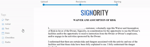 If done correctly, the overlay should be applied and the document will have the tags from the template visible on the Editor page. Add any extra tags you may need, make sure all the tags are properly assigned to their signers, and then send the document to collect your signatures!