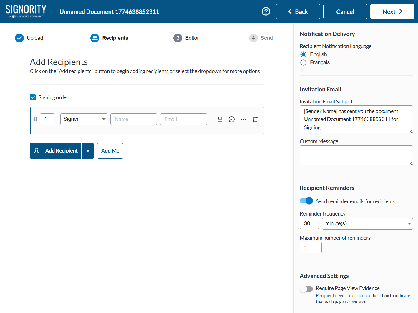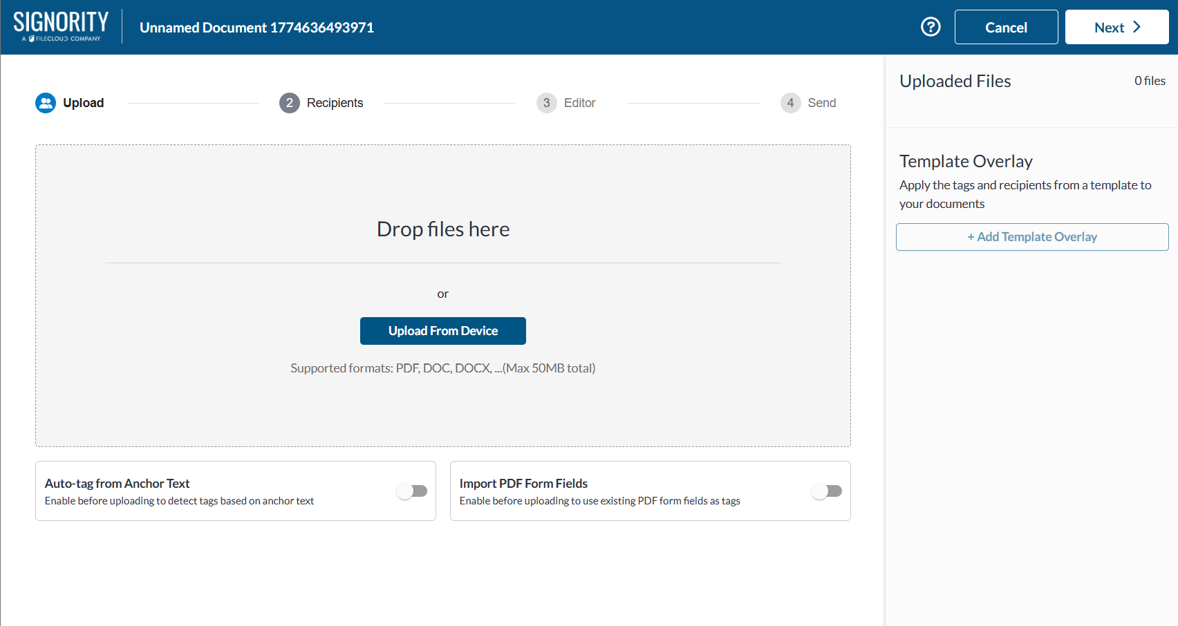 Once you have added the authentication settings, finish your signer list, set any Recipient Settings you need and edit your invitation email and go to the Editor page.- Complete the document preparation by adding Tags to your document. When you’re finished, use the Next button on the top right to send off the document.
